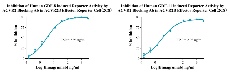 Figure 13.Dose Response of Recombinant Human Activin A  in ACVR2B Effector Cell(2C8).Dose Response of Recombinant Human GDF-8 in ACVR2B Effector Reporter Cell(2C8).Dose Response of Recombinant Human GDF-11 in ACVR2B Effector Reporter Cell (2C8).