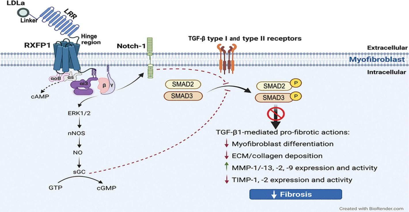 RXFP1 一種 C 型 LGR 相關(guān) GPCR,含有由多個(gè)細(xì)胞外基序組成的約 400 個(gè)氨基酸的大細(xì)胞外區(qū)域,包括富含亮氨酸的重復(fù)結(jié)構(gòu)域(LRR)和低密度脂蛋白 A 類 (LDLa) 模塊,它們通過連接子區(qū)域連接。RXFP1在其 LRR 相關(guān)胞外結(jié)構(gòu)域內(nèi)激活,引發(fā)受體的構(gòu)象變化,然后允許其 7TM 結(jié)構(gòu)域的細(xì)胞外環(huán)內(nèi)低親和力結(jié)合位點(diǎn)的相互作用和激活,這由其連接子區(qū)域促進(jìn)。受體的連接子區(qū)域在配體結(jié)合時(shí)穩(wěn)定受體構(gòu)象方面起著關(guān)鍵作用,并將殘基定位在連接子區(qū)域和 LDLa 模塊內(nèi)以與 7TM 結(jié)構(gòu)域結(jié)合并激活受體。然后,該作用使 LDLa 模塊能夠充當(dāng)系留激動(dòng)劑,并在配體結(jié)合時(shí)引導(dǎo)受體信號傳導(dǎo)。位于 RXFP1 C 末端的鉸鏈區(qū)域在受體激活時(shí)也會(huì)發(fā)生構(gòu)象和增加暴露,以誘導(dǎo) G 蛋白 (Gαs, GαOB, Gαi3和 Gβγ) 活動(dòng)。在肌成纖維細(xì)胞中,這導(dǎo)致 cAMP 短暫升高,但 pERK1/2 增加更持久,nNOS-NO-sGC-cGMP 活性因 RXFP1-ERK1/2 依賴性增加。RXFP1-pERK1/2-nNOS-NO-sGC-cGMP 依賴性途徑的激活或肌成纖維細(xì)胞直接激活 cGMP 然后抑制 SMAD2 和 SMAD3 水平的 TGF-β1 信號轉(zhuǎn)導(dǎo),從而抑制 TGF-β1 促進(jìn)肌成纖維細(xì)胞分化和肌成纖維細(xì)胞誘導(dǎo)的 ECM/膠原蛋白合成和沉積的能力。RXFP1 激活還可以調(diào)節(jié) Notch-1 依賴性信號傳導(dǎo),以抑制肌成纖維細(xì)胞中的 TGF-β1/SMAD3 軸。此外,RXFP1-pERK1/2-nNOS-NO-sGC-cGMP依賴性途徑的激活導(dǎo)致ECM降解MMP的表達(dá)和活性增加(當(dāng)TGF-β1活性上調(diào)時(shí)通常受到抑制),以及TIMP的活性降低,這將促進(jìn)MMP誘導(dǎo)的已建立ECM/膠原沉積的分解,并有助于減少纖維化進(jìn)展。