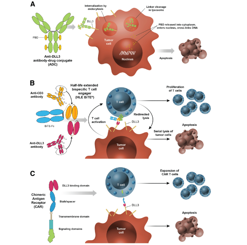 DLL3(Delta-Like Ligand 3, Delta樣配體3)在小細(xì)胞肺癌(SCLC)及神經(jīng)內(nèi)分泌腫瘤(NENs)的治療領(lǐng)域迅速崛起,成為全球藥企競(jìng)相追逐的明星靶點(diǎn)。目前大部分靶向DLL3的藥物主要包括ADC、TCE、單抗、雙抗、三抗、CAR-T等。隨著安進(jìn)(Amgen)的Tarlatamab(一款靶向DLL3/CD3的雙特異性T細(xì)胞接合劑)獲批上市,恒瑞醫(yī)藥、羅氏等藥企的ADC(抗體偶聯(lián)藥物)和雙抗/三抗管線在臨床I/II期試驗(yàn)中均展現(xiàn)出令人驚艷的數(shù)據(jù)。