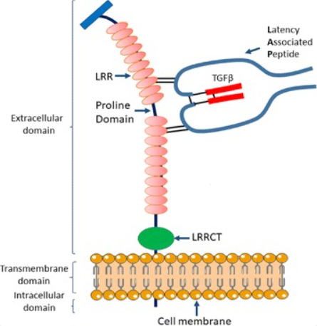 GARP 基因位于人類染色體 9q34.3,GARP蛋白(也稱為 LRRC32)是一種約78 kDa的 I 型跨膜蛋白,由 662 個(gè)氨基酸組成,屬于亮氨酸富集重復(fù)序列(LRR)家族。GARP蛋白根據(jù)其一級(jí)序列在結(jié)構(gòu)上分為三個(gè)結(jié)構(gòu)域:細(xì)胞外結(jié)構(gòu)域、跨膜結(jié)構(gòu)域和細(xì)胞內(nèi)結(jié)構(gòu)域。細(xì)胞外結(jié)構(gòu)域包含兩組 10 個(gè) LRR,由一個(gè)富含脯氨酸的結(jié)構(gòu)域和一個(gè) C 端 LRR (LRRCT) 分隔。兩個(gè)保守的Cys殘基(Cys-192和Cys-331)分別位于第7和第12個(gè)LRR,負(fù)責(zé)潛在TGF-β的GARP和LAP的Cys-4之間形成兩個(gè)二硫鍵。