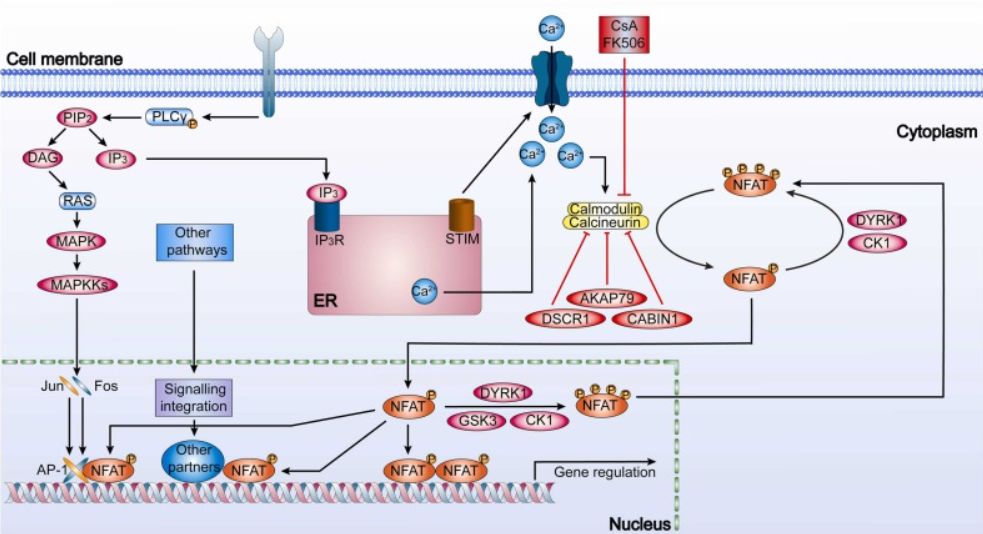 當(dāng)NFAT蛋白在SRR和SP區(qū)域的絲氨酸殘基上被強(qiáng)烈磷酸化時,這些蛋白被限制在細(xì)胞質(zhì)中。細(xì)胞表面受體如T細(xì)胞受體(TCR)、受體酪氨酸激酶(RTKs)和G蛋白偶聯(lián)受體(GPCRs)的激活,引發(fā)信號級聯(lián)反應(yīng)。磷脂酶C(PLC)被激活?;罨疨LC催化了磷脂酰肌醇-4,5-雙膦酸鹽(PIP2)的水解,生成哧啶醇-1,4,5-三磷酸(IP3)和二酰甘油(DAG)。IP3與內(nèi)質(zhì)網(wǎng)表面的IP3R結(jié)合,導(dǎo)致內(nèi)質(zhì)網(wǎng)向細(xì)胞質(zhì)短暫的鈣離子流出,短暫地提高細(xì)胞質(zhì)中的鈣水平,但減少內(nèi)質(zhì)網(wǎng)的鈣儲備。儲備鈣的消耗導(dǎo)致內(nèi)質(zhì)網(wǎng)上的鈣感應(yīng)器STIM形成寡聚體,并遷移至內(nèi)質(zhì)網(wǎng)-質(zhì)膜連接處,在那里它們結(jié)合并激活質(zhì)膜上的Orai(CRAC通道)。Orai形成四聚體通道,開啟持續(xù)的低振蕩性鈣流入,與細(xì)胞質(zhì)中的鈣傳感器鈣調(diào)素(CAM)結(jié)合,形成鈣/鈣調(diào)蛋白/鈣神經(jīng)素復(fù)合物,激活鈣神經(jīng)素。鈣化神經(jīng)素具有催化基(CnA)和調(diào)控亞基(CnB)。活化的CnA脫磷酸化NFAT蛋白并揭露其NLSs,從而實現(xiàn)核易位。