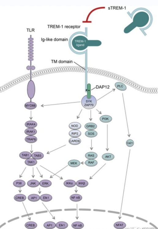 在TREM1被激活后,與其相關(guān)的DAP12蛋白含有ITAMs的胞質(zhì)部分在其酪氨酸殘基上磷酸化,然后與ZAP70和SYK蛋白結(jié)合,使其磷酸化。SYK促進包含Cbl、SOS和GRB2的適應(yīng)性復合物的招募和酪氨酸磷酸化,從而通過PI3K、PLC-Gamma和ERK途徑導致下游信號轉(zhuǎn)導。這些途徑誘導Ca2 +動員,重新排列肌動蛋白細胞骨架和激活轉(zhuǎn)錄因子,如Elk1、NFA、AP1、c-Fos、c-Jun和Nf-κB,這些轉(zhuǎn)錄因子編碼促炎癥細胞因子、趨化因子和細胞表面分子。此外,TREM1誘導的PI3K和ERK途徑的激活可以通過滅活促凋亡因子來促進線粒體的完整性和細胞生存:BID、BAD和BAX,并抑制CytoC從線粒體釋放。