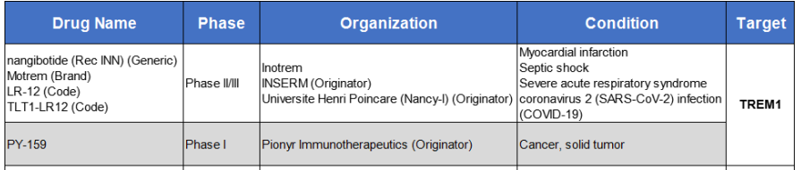 TREM1作為一個新靶點,全球范圍內(nèi)披露的研發(fā)管線不多,針對TREM1靶點有2款產(chǎn)品進入臨床,1款產(chǎn)品即將進入臨床(Celsius公司的CEL383,適應(yīng)癥為炎癥性腸病)。適應(yīng)癥主要為急性感染性疾病、自身免疫性疾病和癌癥。目前TREM1靶點針對癌癥的臨床前藥物比較活躍的是nangibotide(處于臨床II/III期)及PY-159(處于臨床I期)。其中較引人關(guān)注的是Pionyr Immunotherapeutics公司的TREM1抗體PY159正在與帕博利珠單抗聯(lián)合用于晚期實體瘤患者的Ia/Ib期研究。PY159 是一種人源化單克隆抗體,能特異性地結(jié)合表達在髓系細胞上的TREM1,并通過交聯(lián)TREM1/DAP12 復合物誘導下游信號傳導,發(fā)揮激動劑的作用。2023年 ASCO報道的 PY159 的用于冷腫瘤相關(guān)瘤種的I期的臨床研究,結(jié)果顯示總體安全性可控,療效方面 ORR 為 6%,DCR 為 33%,其中胰腺癌患者展現(xiàn)出較好的療效??偟膩碚f,TREM1靶點藥物的作用機理和效果還不是非常明確,正在研發(fā)的藥物療效也不是很出色,未來前景還值得繼續(xù)觀察。
