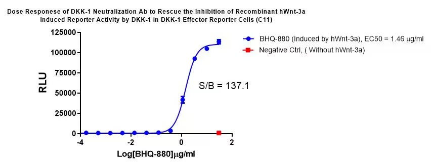 Figure 1. Dose Responese of DKK-1 Neutralization Ab to Rescue the Inhibition of Recombinant hWnt-3a Induced Reporter Activity by DKK-1 in DKK-1 Effector Reporter Cells (C11).