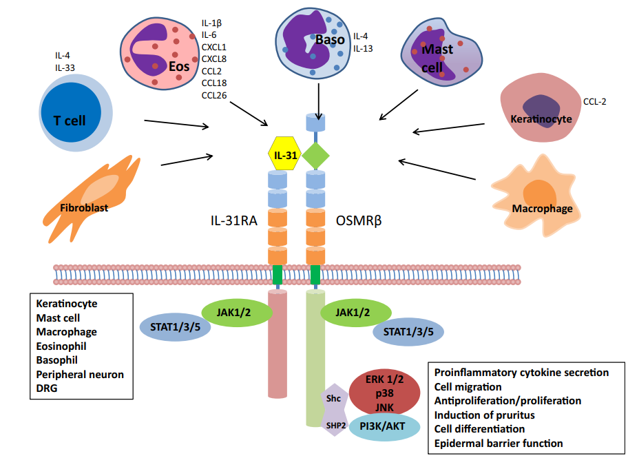 IL-31(白細胞介素31)于2004年被Dillon等人發(fā)現(xiàn),是一種四螺旋束細胞因子,有2個長螺旋和2個短螺旋,屬于糖蛋白130 (gp130)/IL-6細胞因子家族。IL-31最初被證明是由激活的輔助T細胞產(chǎn)生的,尤其是Th2細胞、肥大細胞、巨噬細胞和樹突狀細胞,此外在嗜酸性粒細胞、嗜堿性細胞等中也有IL-31的表達。IL-31與瘙癢感覺神經(jīng)纖維表面IL-31RA亞基結(jié)合,激活OSMR亞基發(fā)生異構(gòu),主要通過磷脂酰肌醇30-激酶/蛋白激酶(PI3K/AKT)通路、Janus激酶/信號轉(zhuǎn)換器和轉(zhuǎn)錄激活因子(JAK/STAT)通路及絲裂原激活的蛋白激酶(Ras/Raf/MAPK)通路。IL-31信號通路的下游轉(zhuǎn)錄因子的激活會參與不同的基因表達,比如炎癥、遷移、分化、(抗)增殖、細胞存活和屏障功能等。