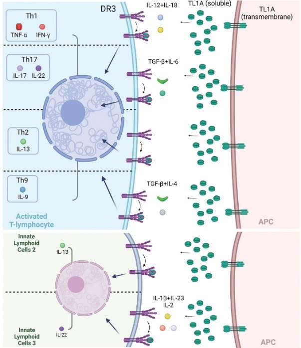 TL1A/DR3信號的下游作用包括產(chǎn)生幾種關(guān)鍵的因子,如IFN-γ、TNF-α、IL-6和IL-17,以及IL-2、IL-4、IL-13,這些促炎因子表達上調(diào),并可能產(chǎn)生致病作用。