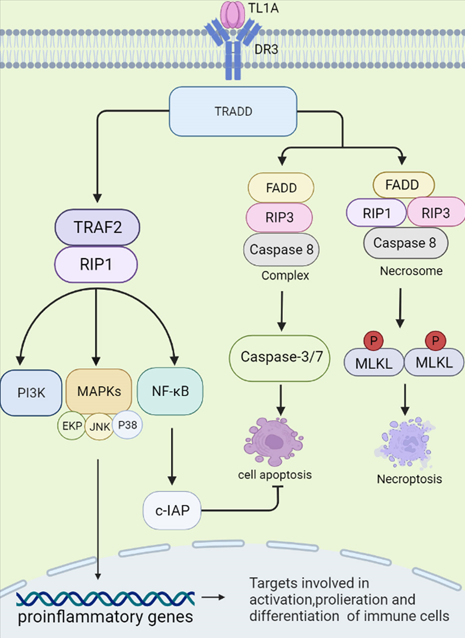 在靜息的T細胞中,DR3以可溶性形式表達,保護細胞免于凋亡?;罨腡細胞表達跨膜DR3。sTL1A結(jié)合DR3 (膜結(jié)合形式)激活下游信號級聯(lián),從而調(diào)節(jié)免疫反應(yīng)和炎癥。sTL1A/DR3相互作用可觸發(fā)兩種不同的信號通路,分別引起炎癥和細胞凋亡。首先,DR3的死亡結(jié)構(gòu)域與細胞質(zhì)中的適配蛋白TNFR相關(guān)死亡結(jié)構(gòu)域蛋白(TRADD)結(jié)合,然后招募TNFR相關(guān)因子2 (TRAF2)和受體相互作用蛋白1 (RIP1)。這些復(fù)合物激活MAPKs (ERK、p38和JNK)、NF-κB和效應(yīng)激酶PI3K信號傳導(dǎo)。最后,激活的信號傳導(dǎo)調(diào)節(jié)促炎基因的表達,參與免疫相關(guān)疾病的發(fā)生。TRADD結(jié)合FAS相關(guān)死亡結(jié)構(gòu)域(FADD)和RIP3,激活半胱氨酸天冬氨酸特異性蛋白酶-8 (caspase-8)形成復(fù)合物,進一步激活下游caspase通路(如caspase-3和-7),誘導(dǎo)凋亡細胞死亡。當(dāng)caspase-8活性被阻斷時,F(xiàn)ADD、RIP3、RIP1與下游效應(yīng)分子混合譜系激酶結(jié)構(gòu)域樣蛋白(mixed lineage kinase domain-like protein, MLKL)在磷酸化后形成胞質(zhì)“壞死體”復(fù)合體。然后,MLKL寡聚到細胞膜上,導(dǎo)致壞死性細胞死亡,這是一種伴有強烈炎癥的細胞死亡形式。在這個過程中,NF-κB被證明可以誘導(dǎo)細胞凋亡抑制蛋白(c-IAP)的激活,從而介導(dǎo)細胞凋亡的負反饋調(diào)節(jié)和抑制。事實上,更多的證據(jù)表明,sTL1A與DR3的連接優(yōu)先誘導(dǎo)淋巴細胞的促炎途徑而不是凋亡。